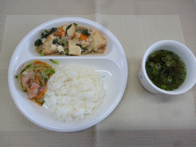 今日の給食は、「厚揚げの炒め物」、「バンサンス」と「わかめのすまし汁」 おやつは、「牛乳」、「オレンジ」と「ハッピーターン」です。