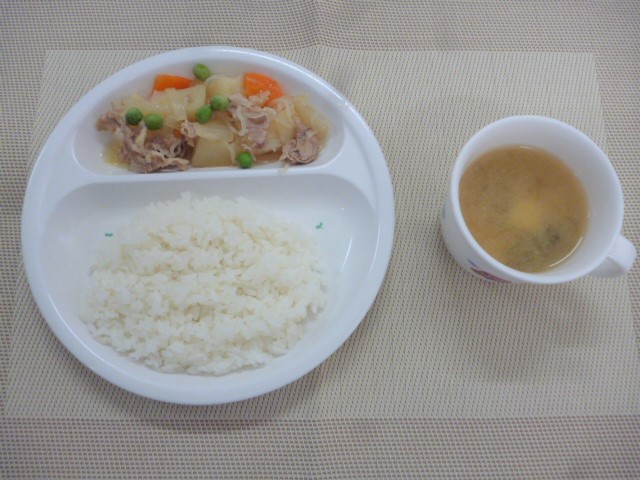 今日の給食は、「肉じゃが」と「小松菜のみそ汁」 おやつは、「牛乳」と「お楽しみおやつ」です。