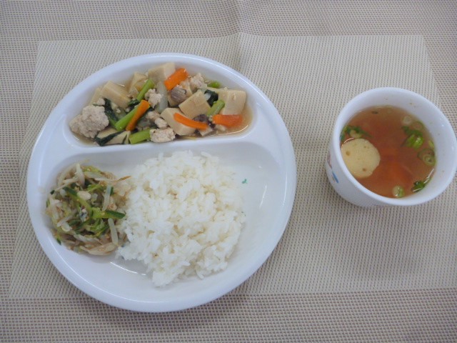 令和4年12月21日(水)の献立 2022/12/21 今日の給食は、「高野豆腐とひき肉の煮物」、「もやしとえのきのナムル」と「麩のすまし汁」 おやつは、「牛乳」、「にんじん蒸しパン」と「雪の宿」です。