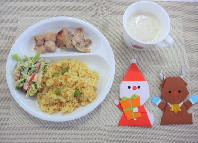 今日の給食は、「カレーピラフ」、「鶏肉のレモン焼き」、「クリスマスサラダ」と