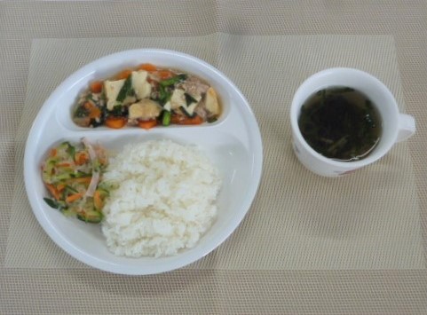 今日の給食は、「厚揚げの炒め物」、「バンサンス」と「わかめのすまし汁」
