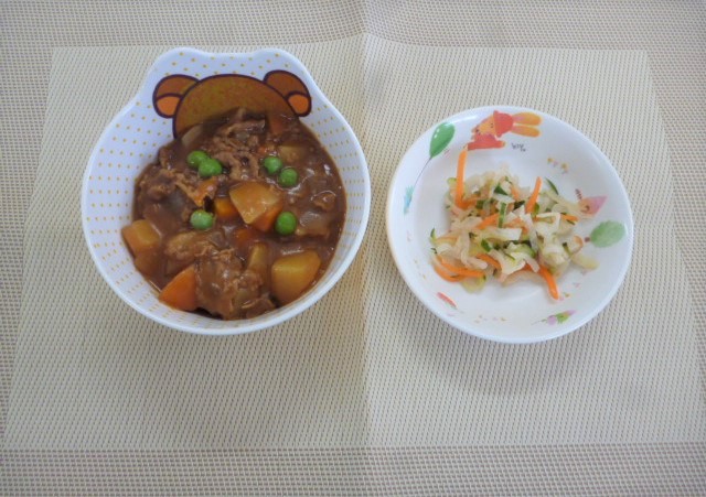 令和4年12月27日(火)の献立 2022/12/27 みんな大好きなカレーライス🍛 今年最後の提供です! 今日の給食は、「カレーライス」と「切干大根のサラダ」 おやつは、「牛乳」、「マシュマロサンド」と「こんぶ」です。