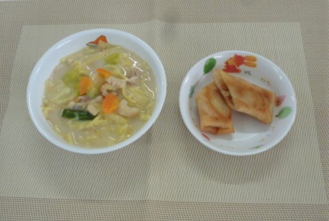 今日の給食は、「ちゃんぽんラーメン」と「春巻き」 おやつは、「牛乳」と「お楽しみおやつ」です。