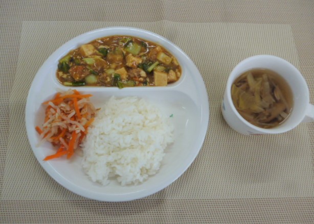 令和5年1月26日(木)の献立 2023/01/26 今日の献立は、「豆腐のカレーあん」、「もやしのごま和え」と「切干大根のすまし汁」 おやつは、「牛乳」、「コーンハム蒸しパン}と「ハッピーターン」です。