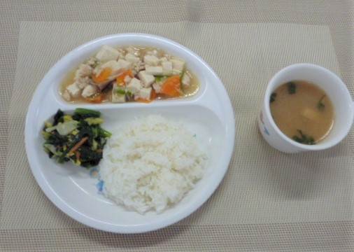 今日の給食は、「豆腐のきのこあんかけ」、「白菜のマヨポン和え」と「大根のみそ汁」