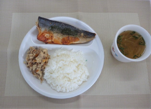 今日の給食は、「さばの磯辺焼き」、「卯の花炒り」と「キャベツのすまし汁」