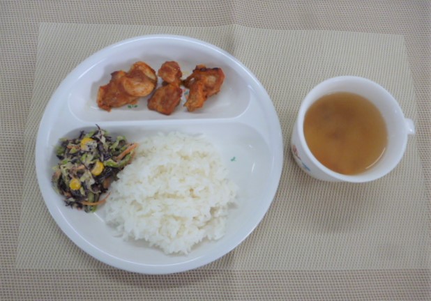 今日の給食は、「タンドリーチキン」、「ひじきのサラダ」と「野菜スープ」