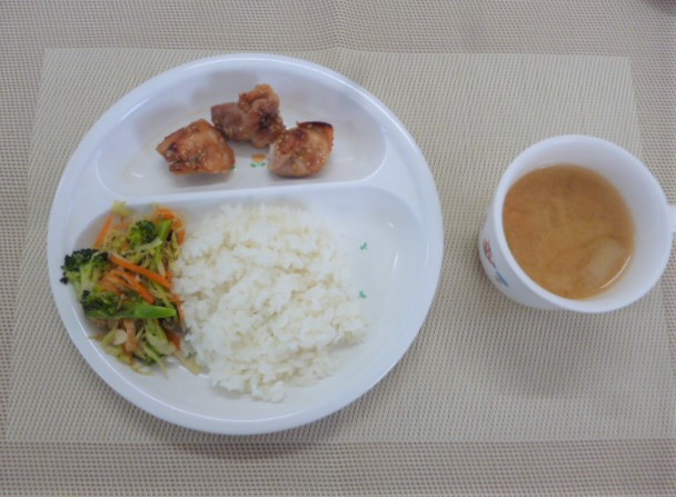 今日の給食は、「鶏肉のごま照り焼き」、「ブロッコリーのおかか和え」と「厚揚げのみそ汁」 おやつは、「牛乳」、「りんご」と「星たべよ」です。
