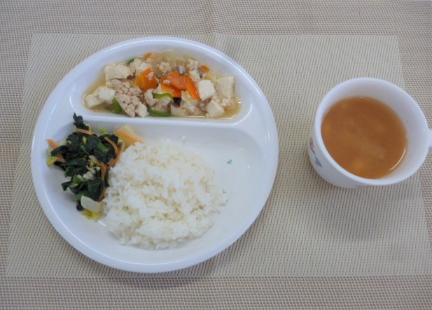 今日の給食は、「豆腐のきのこあんかけ」、「白菜のマヨポン和え」と「大根のみそ汁」 おやつは、「牛乳」、「オレンジ」と「白い風船」です。