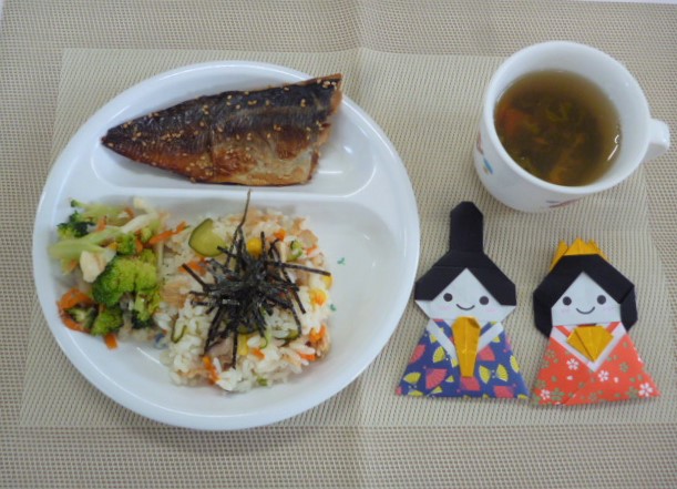 今日の給食は、「ちらし寿司」、「あじの南部焼き」、「花野菜のお浸し」と「菜の花のすまし汁」