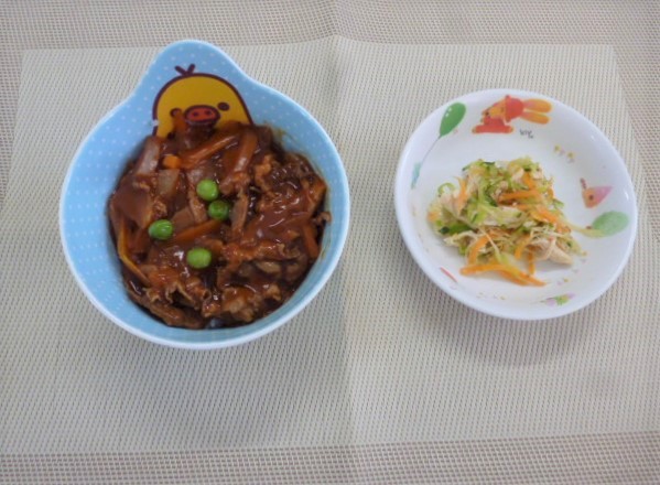 今日の給食は、「ハヤシライス」と「キャベツとささみの中華サラダ」 おやつは、「牛乳」、「みかん缶」と「まがりせんべい」です。