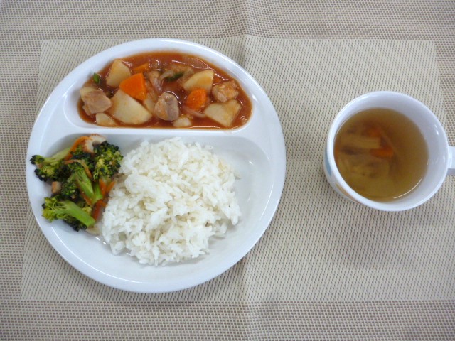 今日の給食は、「鶏肉のケチャップ煮」、「ブロッコリーのごま和え」と「きのこのスープ」
