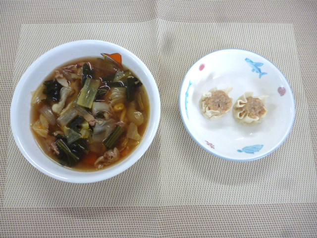 今日の給食は、「しょうゆラーメン」と「シュウマイ」 おやつは、「牛乳」と「お楽しみおやつ」です。