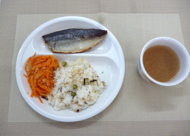 令和5年5月9日(火)の献立 2023/05/09 今日の給食は、「豆ごはん」、「あじの塩焼き」、「にんじんしりしり」と「なすのみそ汁」 おやつは、「牛乳」と「チヂミ」です。 ★「豆ごはん」に入っているえんどう豆は、昨日ほし組さんがむいてくれた豆です! ほし組さん、ありがとう✨
