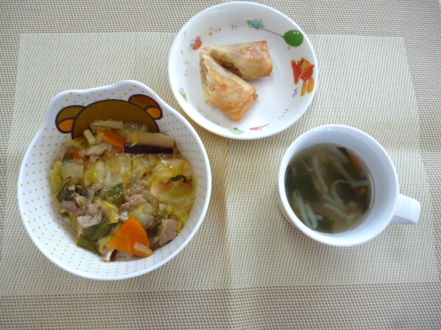 今日の給食は、「中華丼」、「春巻き」と「はるさめスープ」 おやつは「牛乳」と「小倉サンド」です。
