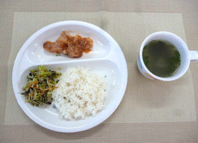 今日の給食は、「ヤンニョム風チキン」、「キャベツのチョレギサラダ」と「じゃが芋のスープ」