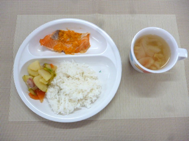 今日の給食は、「鮭のオーロラソース焼き」、「アスパラソテー」と「白菜のスープ」