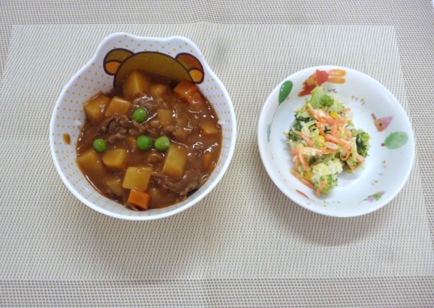 今日の給食は、「カレーライス」と「蒸し野菜のサラダ」 おやつは、「牛乳」、「マカロニきなこ」と「チーズ」です。