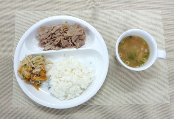 今日の給食は、「豚肉のしょうが焼き」、「切干大根のごま和え」と「具沢山みそ汁」