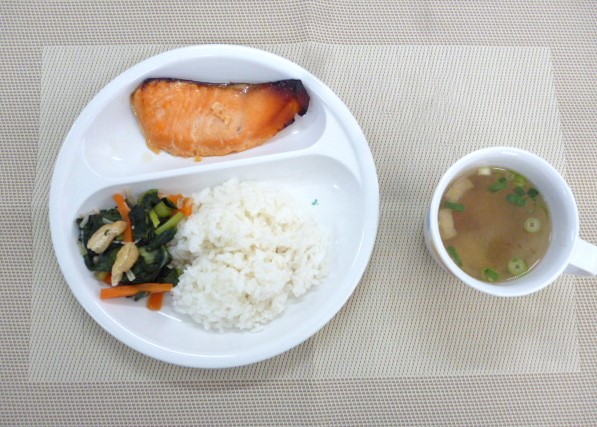今日の給食は、「鮭の西京焼き」、「小松菜とあげの煮びたし」と「けんちん汁」