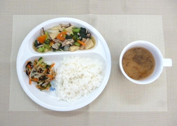 今日の給食は、「高野豆腐の中華炒め煮」、「もやしのごま酢和え」と「じゃがいものみそ汁」