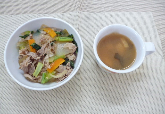 今日の給食は、「豚丼」と「豆腐のみそ汁」 おやつは、「牛乳」と「お楽しみおやつ」です。