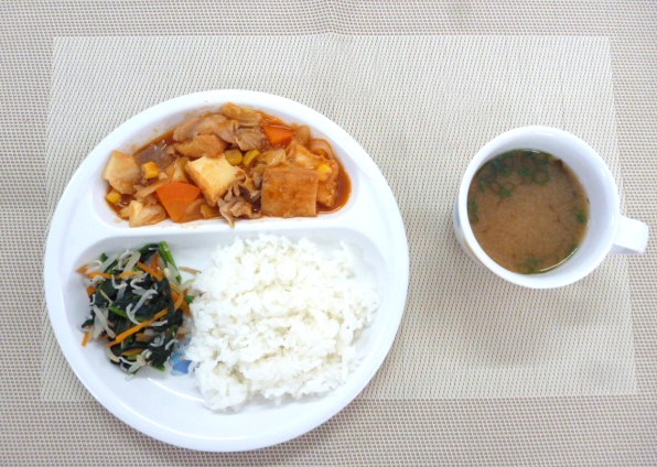 今日の給食は、「厚揚げのケチャップ煮」、「ほうれん草のしらす和え」と「玉ねぎのみそ汁」