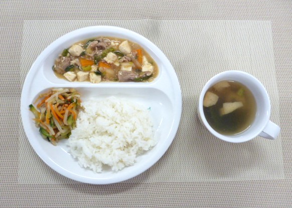 今日の給食は、「豆腐と豚肉のみそ炒め」、「もやしのナムル」と「小松菜のすまし汁」