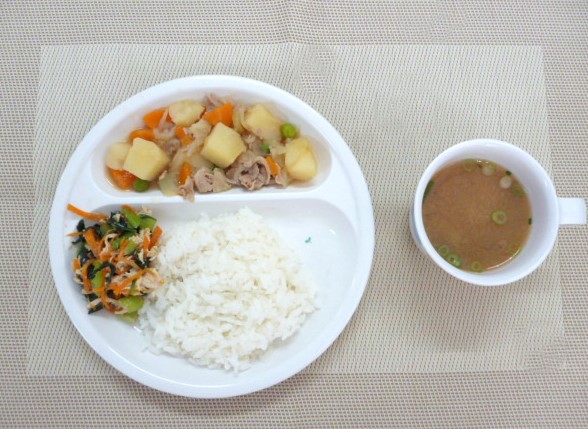 今日の給食は、「肉じゃが」、「小松菜とささみのごまみそ和え」と「キャベツのみそ汁」 おやつは、「牛乳」、「オレンジ」と「星たべよ」です。