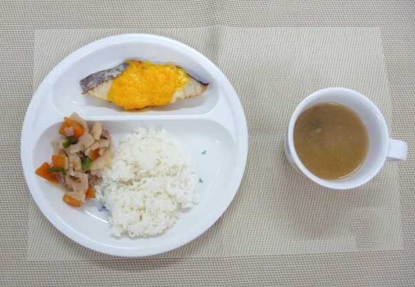 令和5年10月3日(火)の献立 2023/10/03 今日の給食は、「白身魚の紅葉焼き」、「きんぴられんこん」と「豆腐のみそ汁」 おやつは、「牛乳」、「焼きおにぎり」と「ぽりぽり小魚」です。 ★「白身魚の紅葉焼き」の魚は、さわらです🐟