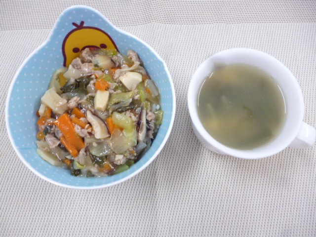 今日の給食は、「あんかけチャーハン」と「豆腐のスープ」