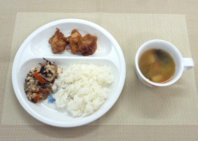 今日の給食は、「鶏肉のごまみそ焼」、「炒り豆腐」と「里芋のみそ汁」 おやつは、「牛乳」と「ツナサンド」です。