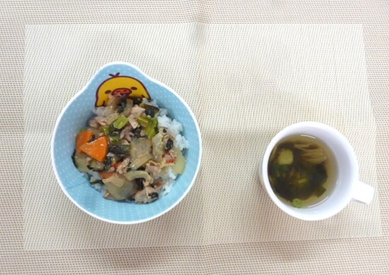 今日の給食は、「豚肉の甘みそ丼」と「じゃがいものすまし汁」 おやつは、「牛乳」と「お楽しみおやつ」です。