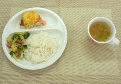 今日の給食は、「白身魚のカレーマヨ焼き」、「ブロッコリーとさつまいものソテー」と「チキンスープ」