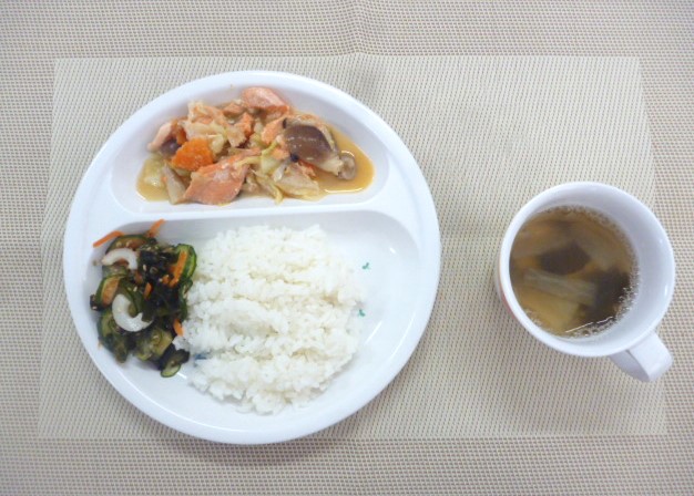 令和5年11月9日(木)の献立 2023/11/09 今日の給食は、「鮭のちゃんちゃん焼き」、「きゅうりの酢の物」と「豆腐のすまし汁」 おやつは、「牛乳」、「セサミマカロニ」と「チーズ」です。 ★「セサミマカロニ」は新メニューです🍴