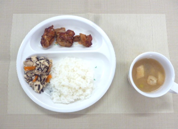 今日の給食は、「鶏肉のごまみそ焼き」、「炒り豆腐」と「里芋のみそ汁」