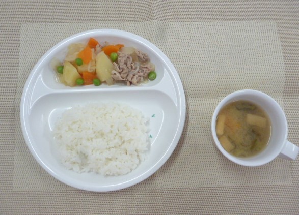 今日の給食は、「肉じゃが」と「小松菜のみそ汁」 おやつは、「牛乳」と「お楽しみおやつ」です。