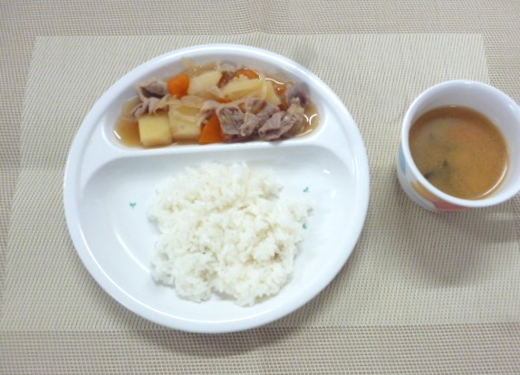今日の給食は、「肉じゃが」と「小松菜のみそ汁」
