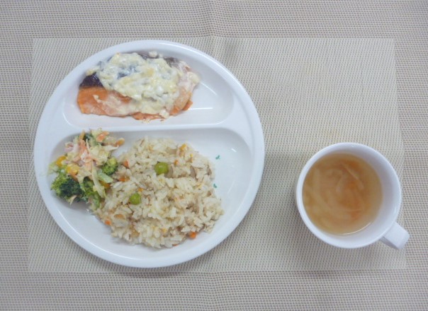 令和6年1月12日(金)の献立 2024/01/12 今日は、お誕生日会です🍰✨ 1月生まれのお友達、お誕生日おめでとう🎍 今日の給食は、「鶏とごぼうのピラフ」、「鮭のマヨネーズ焼き」、「蒸し野菜サラダ」と 「オニオンスープ」 おやつは、「牛乳」と「バナナスクエア」です。 ★「鮭のコーンフレーク焼き」は、「鮭のマヨネーズ焼き」に変更となりました。 ★「鶏とごぼうのピラフ」は新メニューです🍴