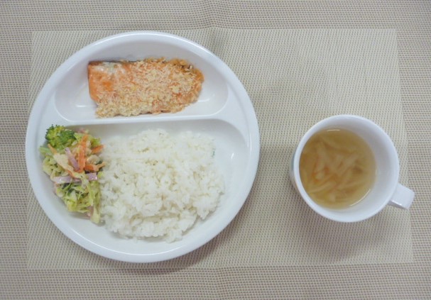 令和6年1月26日(金)の献立 2024/01/26 今日の給食は、「鮭のパン粉焼き」、「蒸し野菜のサラダ」と「オニオンスープ」 おやつは、「牛乳」、「バナナ」と「新潟仕込み」です。 ★「鮭のコーンフレーク焼き」は、「鮭のパン粉焼き」に変更となりました。