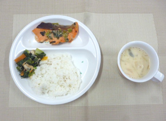 今日の給食は、「鮭のねぎみそ焼き」、「小松菜とあげの煮浸し」と「豆乳汁」 おやつは、「牛乳」、「じゃが芋のチーズ焼き」と「ぽりぽり小魚」です。