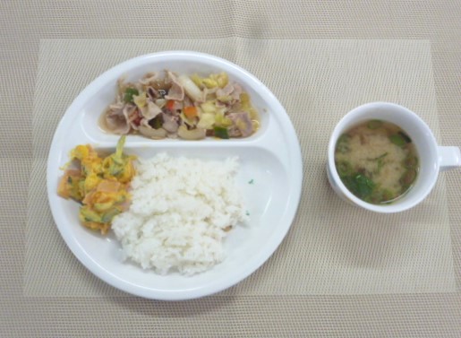 今日の給食は、「豚肉とキャベツのごま炒め」、「かぼちゃサラダ」と「厚揚げのみそ汁」