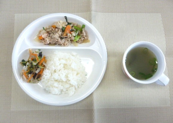 今日の給食は、「プルコギ風炒め」、「大根のごま酢和え」と「豆腐スープ」