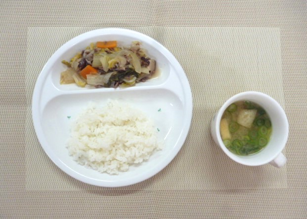 今日の給食は、「すき焼き煮」と「豆腐のみそ汁」 おやつは、「牛乳」と「お楽しみおやつ」です。