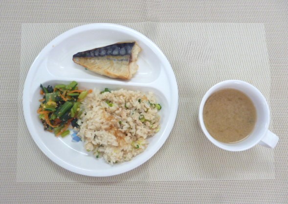 今日の給食は、「とりそぼろ混ぜごはん」、「さばの塩焼き」、「小松菜のごま和え」と