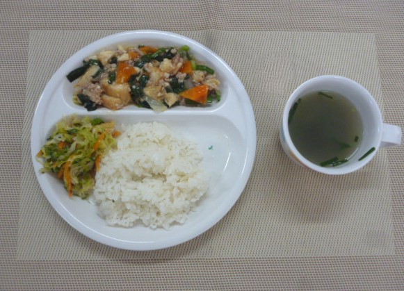 今日の給食は、「厚揚げの炒め物」、「キャベツのおかか和え」と「中華スープ」