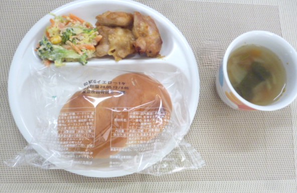 今日の給食は、「イエローロールパン」、「ハニースパイシーチキン」、「蒸し野菜のサラダ」と