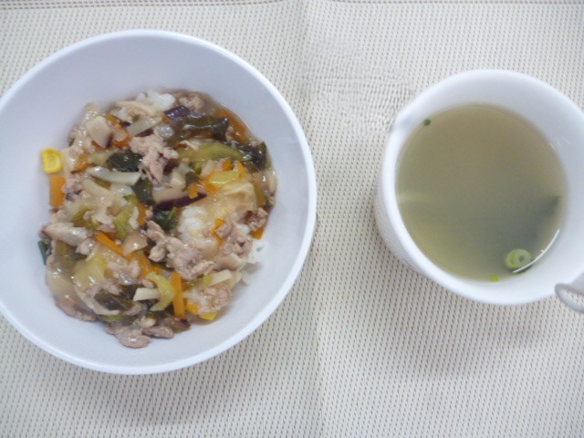 今日の給食は、「あんかけチャーハン」と「中華スープ」です。 おやつは、「牛乳」、「お楽しみおやつ」です。