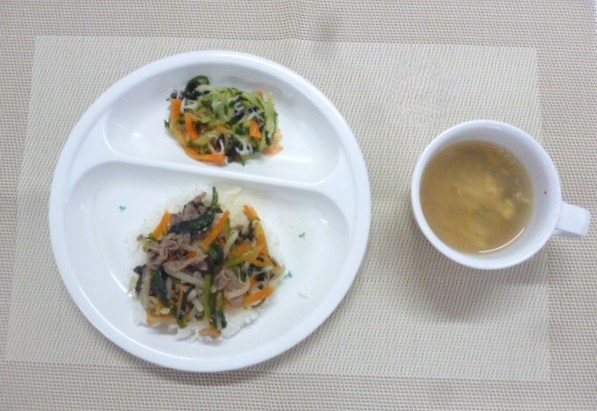 令和6年5月27日(月)の献立 2024/05/27 今日の給食は、「ビビンバ」、「きゅうりとしらすの酢の物」と「かき玉汁」 おやつは、「牛乳」、「オレンジ」と「しょうゆせんべい」です。 ★おやつの「しょうゆせんべい」は「まがりせんべい」でした。