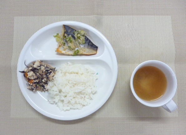 今日の給食は、「さばのレモン醤油焼き」、「炒り豆腐」と「小松菜のみそ汁」